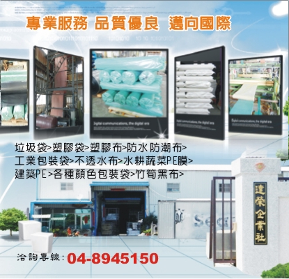 垃圾袋、鋼鐵包裝、竹筍布、覆蓋布、防水布、防潮布、PE包裝袋、環保PE、工業用包裝膜、工業用包裝布、建築用防水布、建築用防水膜、工業包裝袋、竹筍黑布、超大垃圾袋、水耕蔬菜塑膠布、建築用塑膠布、建築用防潮膜、建築用防潮布、冷凍櫃、景觀、水池布、發泡、隔層袋、防水、防塵布、建築PE、清潔袋、不透水布、塑膠布、水耕蔬菜PE黑布、大城防水、PE塑膠布、防水防潮布、地工膜、防滲透布、農用膜、彰化PE包裝袋、彰化不透水布、彰化地工膜、彰化垃圾袋、彰化水耕蔬菜塑膠布、彰化防水膜、彰化工業包裝袋、彰化竹筍黑布